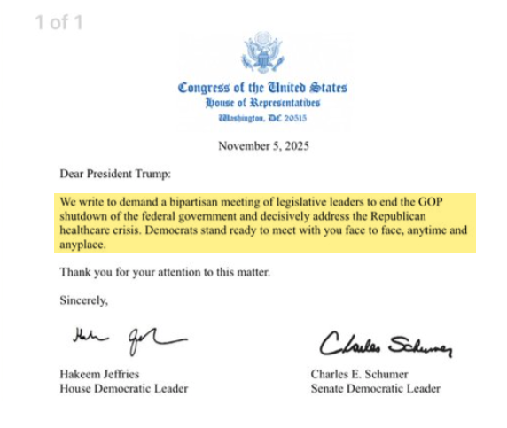 询查院少数党首领查克·舒默(Chuck Schumer)与众议院少数党首领哈基姆·杰弗里斯(Hakeem Jeffries)联名致信特朗普总统,信中明确暗示:“咱们致信要求举行一次两党立法首连系议,以兑现共和党酿成的政府停摆,并轻浮搞定共和党的医疗保健危险。民主党东谈主随时准备与您面对面会谈。”