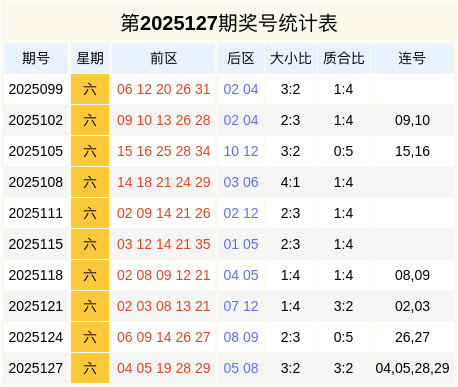 连码分析:上周六开出连号为04,05,28,29,在近10期同周六的奖号数据中,开出连号的概率为60.00%,本周六瞻望不会开出连号。