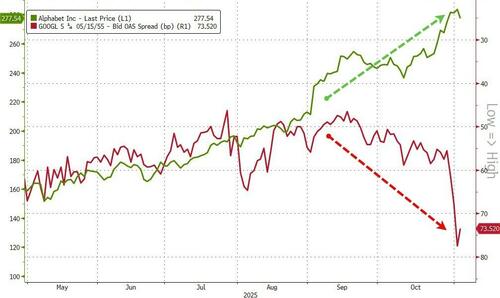 事实上,近来部分商场东说念主士寄望到的一个表象是,部分TMT板块投资级信贷钞票与TMT股票的走势已显耀脱钩。近期谷歌、META和甲骨文股价与其关系信贷钞票的价钱走势不对,便能印证这小数……