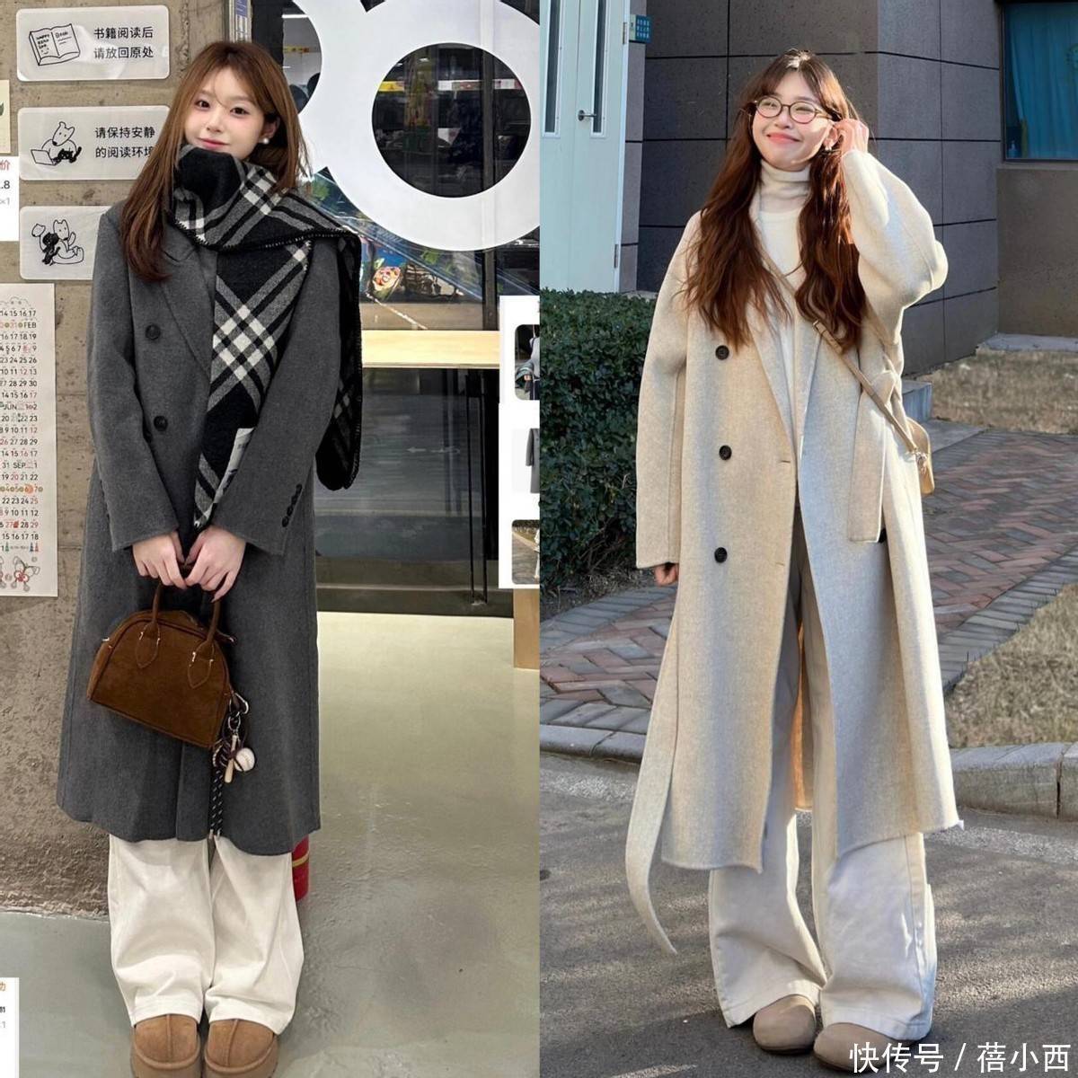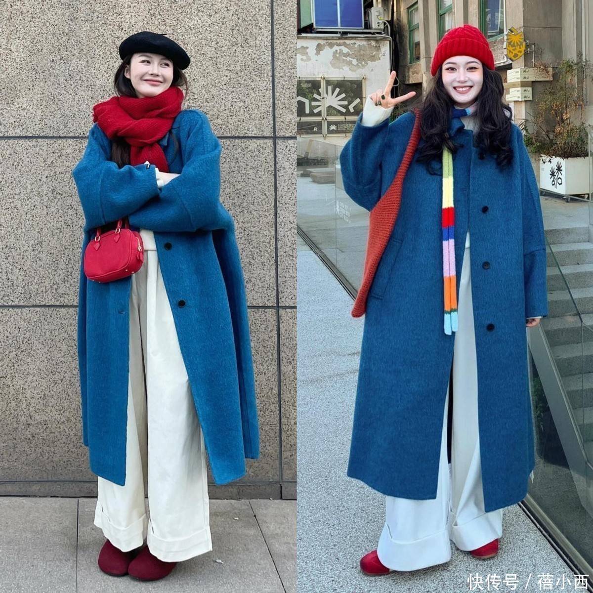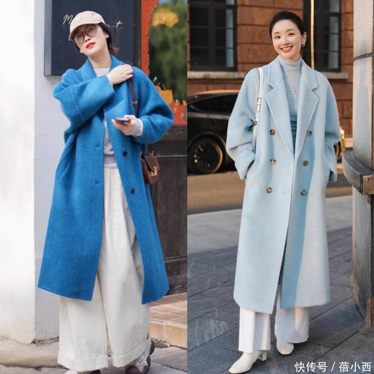 雾霾蓝大衣+白色阔腿裤的组合很适宜冬天,雾霾蓝行为低填塞度的流行色,自带阴寒高等感,对黄皮也相配友好,搭配白色阔腿裤,极新又显白。