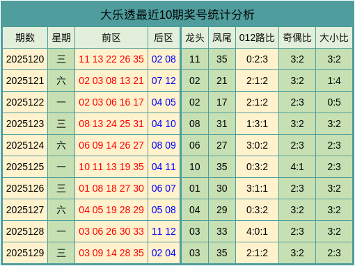 上期的后区奖号为02、04,近10期后区奖号分析,得突出偶比7:13,大小比为11:9,012路比为4:7:9。本期看好后区开出小大数、奇奇数面目,后区参考05,11。