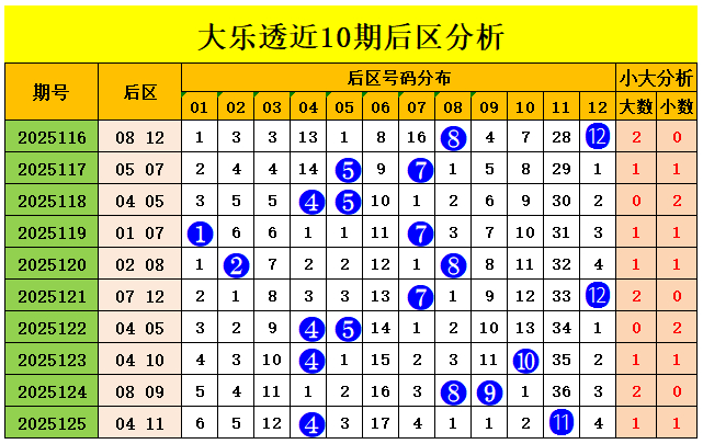 大乐透后区5码推荐:01 05 07 11 12