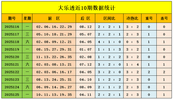 上期回顾:大乐透第2025125期奖号为:前区10、11、13、19、35,后区04、11,前区奖号三区比为2:2:1,冷热比为2:3,后区开出小大组合04、11