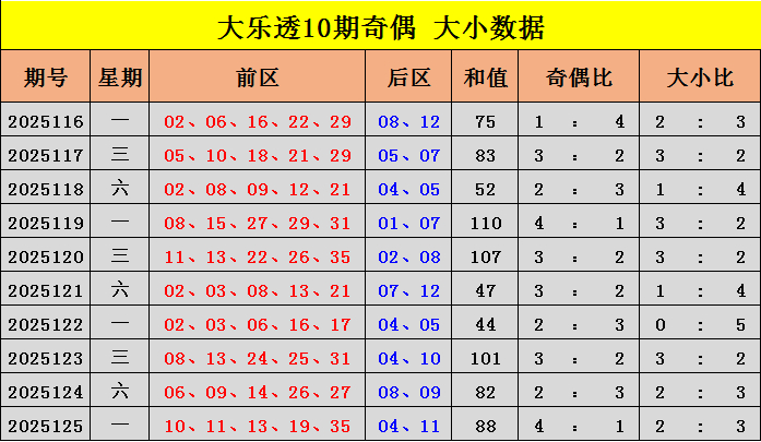 大小比分析:上期大小比2:3,近10期大小总比值20:30;近3期大小总比值为7:8,小码开出率高,综合分析,预计小码出号较多,推荐大小比2:3。