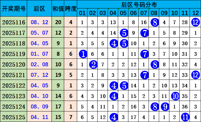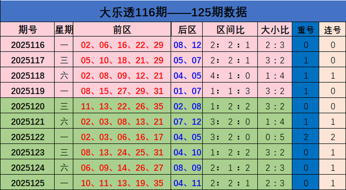上期后区开出:04 11,为小大组合,最近5期后区号码大小走势为:大大-小小-小大-大大-小大。大大、小大组合较多。综合分析,本期推荐小大组合,本期精选号码:06 08.
