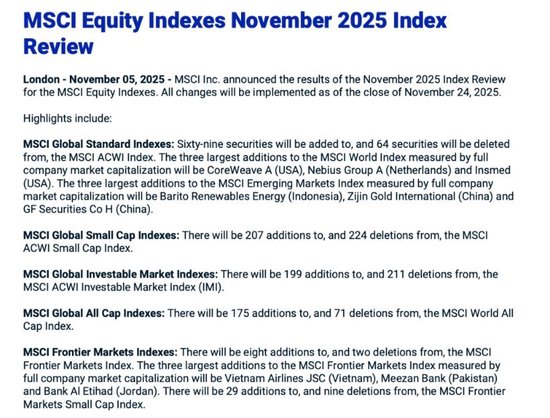按总市值计较,MSCI众人指数新增的最大3只证券为好意思国CoreWeave A、荷兰Nebius Group A、好意思国Insmed。MSCI新兴商场指数新增的最大3只证券为印度尼西亚Barito Renewables Energy、中国紫金黄金海外、中国广发证券H股。