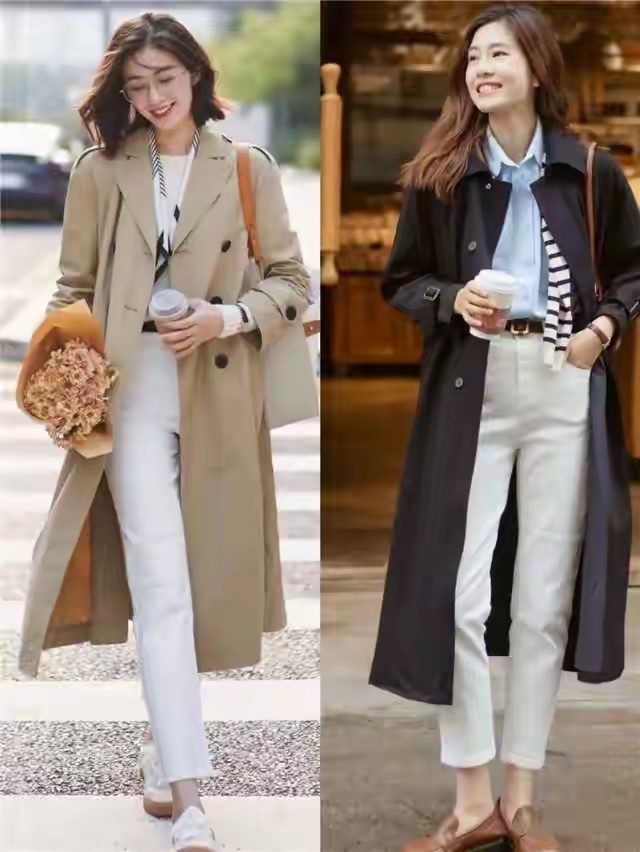 举例底下第一位博主遴荐的即是一件高腰收腰款的卡,其色风衣外衣内搭一件白色衬衫和一条白色的西装阔腿裤,脚上穿的白色的浅口高跟单鞋,这么的穿搭,御姐范实足,非论穿去上班逛街都完全莫得任何问题,通勤又好意思丽。