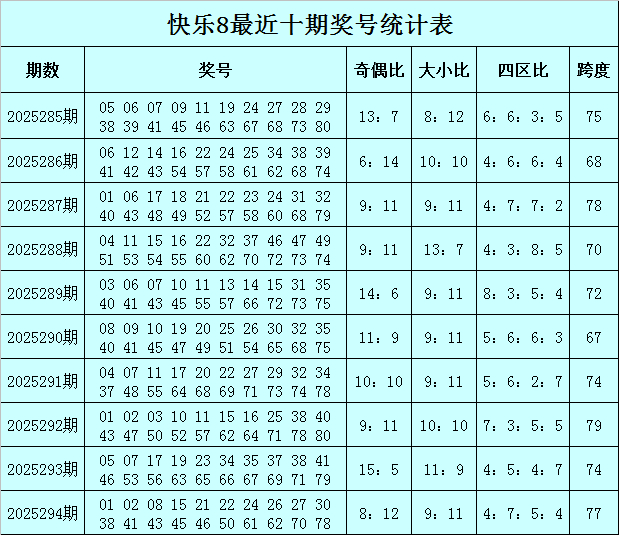 福彩快乐8第2025294期开奖回顾:01 02 08 15 21 22 24 26 27 30 38 41 43 45 46 50 61 62 70 78,其中奖号012路比为7:6:7,奖号尾数012路比为6:6:8。