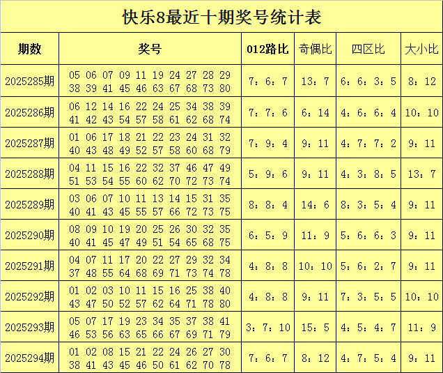 福彩快乐8第2025294期开奖回顾:01 02 08 15 21 22 24 26 27 30 38 41 43 45 46 50 61 62 70 78,其中奖号012路比为7:6:7,四区比为4:7:5:4奇偶比为8:12,大小比为9:11。